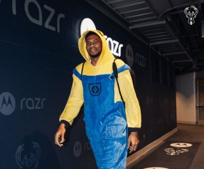 字母哥因为膝盖酸痛赛季首次缺席,字母哥穿小黄人衣服引发关注。